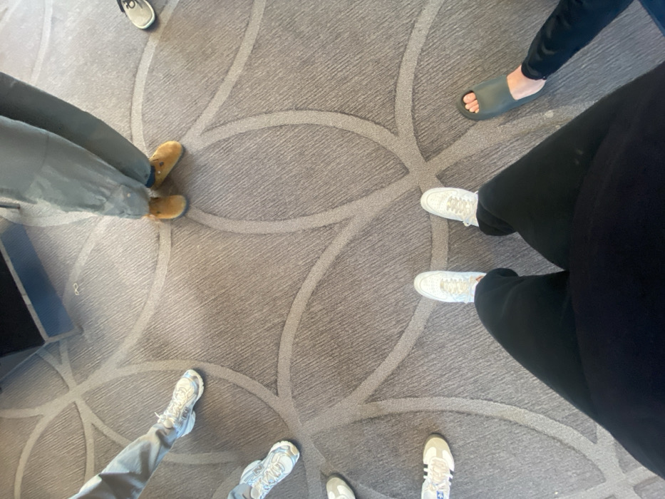 An overhead view captures the lower extremities of at least six individuals standing in a loose circular formation on a patterned grey carpet in an indoor setting within Princeton, United States