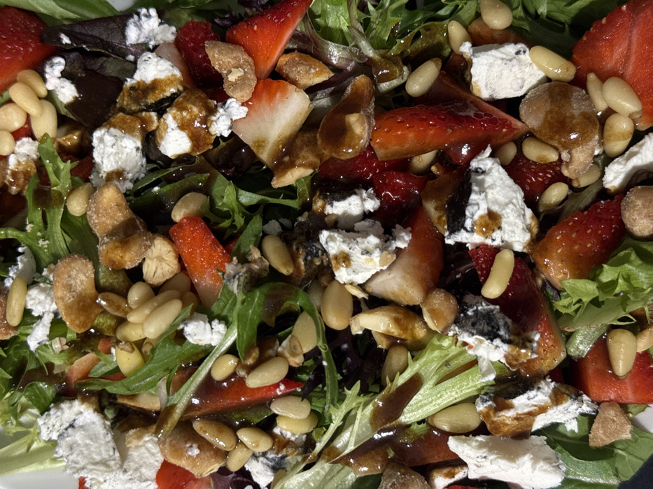 A vibrant salad bursts with color. Leafy greens form the base, dotted with bright red strawberry slices and dollops of creamy white cheese, possibly goat cheese. Pine nuts are scattered throughout, adding texture and visual interest. A glossy brown balsamic glaze is drizzled over the ingredients, enhancing the flavors and creating a visually appealing sheen. The ingredients are fresh and appealing.