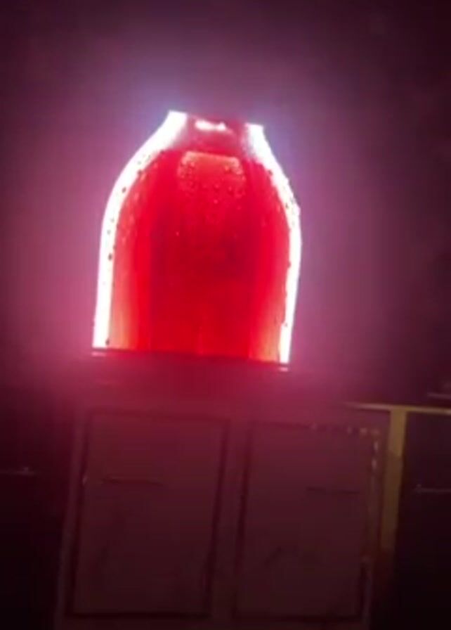 A close-up shot features a large, clear container filled with a red liquid, illuminated with a bright, glowing light