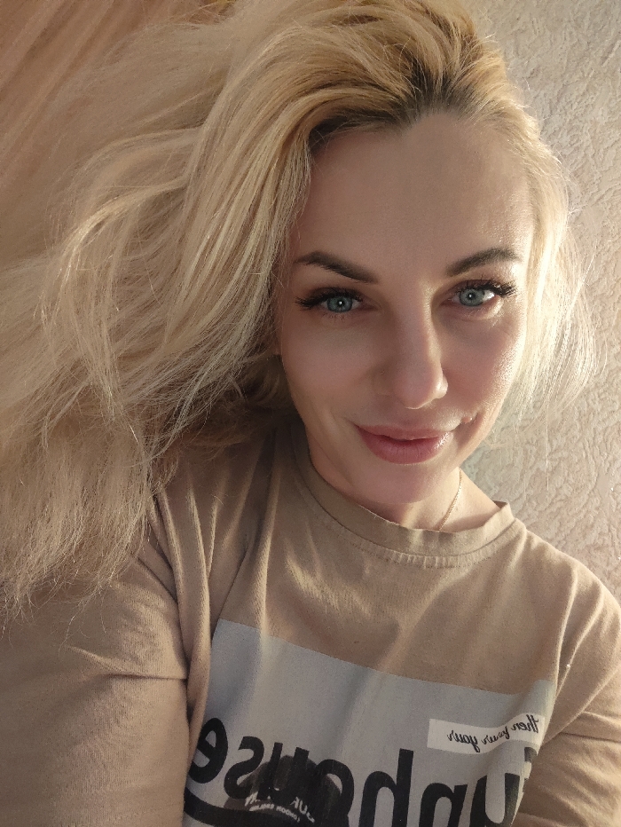 A blonde woman with striking blue eyes smiles at the camera. Her light hair is voluminous and partially obscures one side of her face. She wears a neutral-colored T-shirt with a printed design. The image appears to be a selfie or close-up portrait, with the background slightly out of focus. The lighting highlights her features, emphasizing her eyes and complexion.
