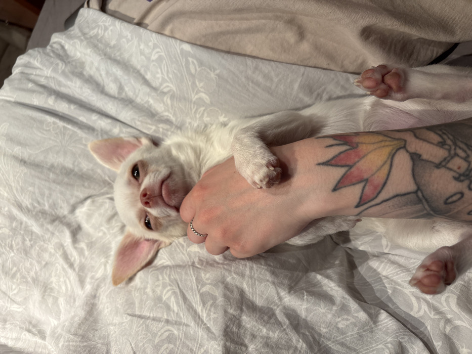 - "An overhead shot shows a light-colored chihuahua lying on its back in a person's arm" by FM-08PzB2, licensed under CC BY 4.0