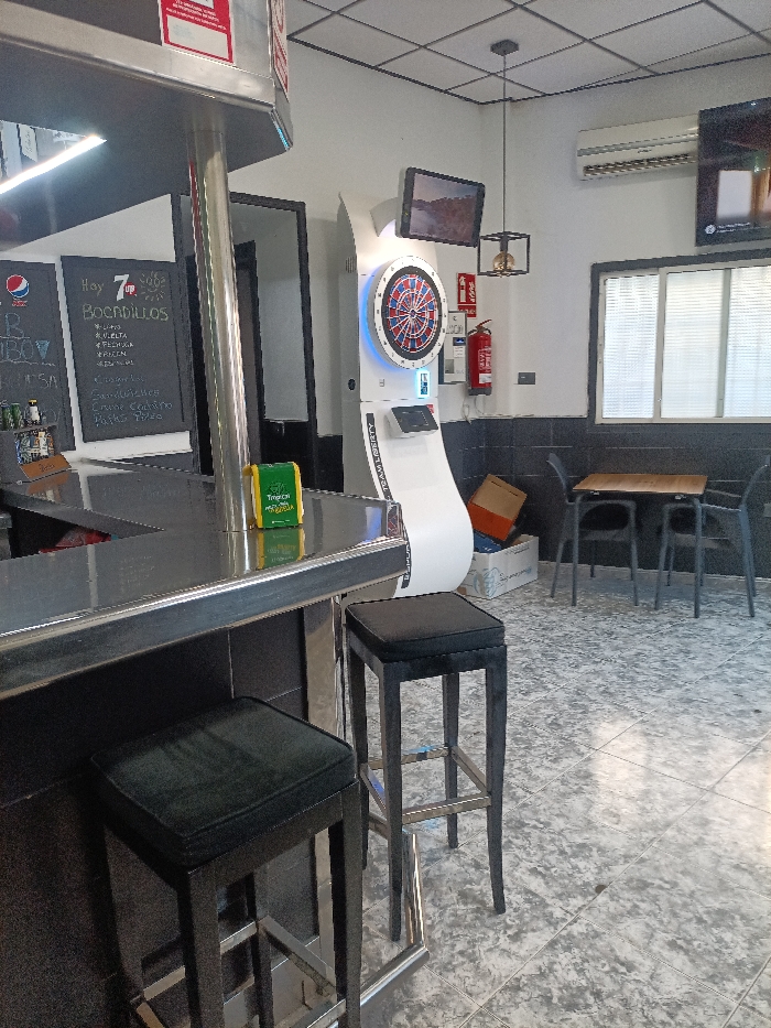 A bar area features a dark countertop with two tall, square stools. A chalkboard displays menu items. To the right, a digital dartboard stands against a white wall, flanked by a fire extinguisher. In the background, a small table with four chairs sits near a window, with a television mounted above. A modern light fixture hangs from the ceiling. A box sits near the dartboard.