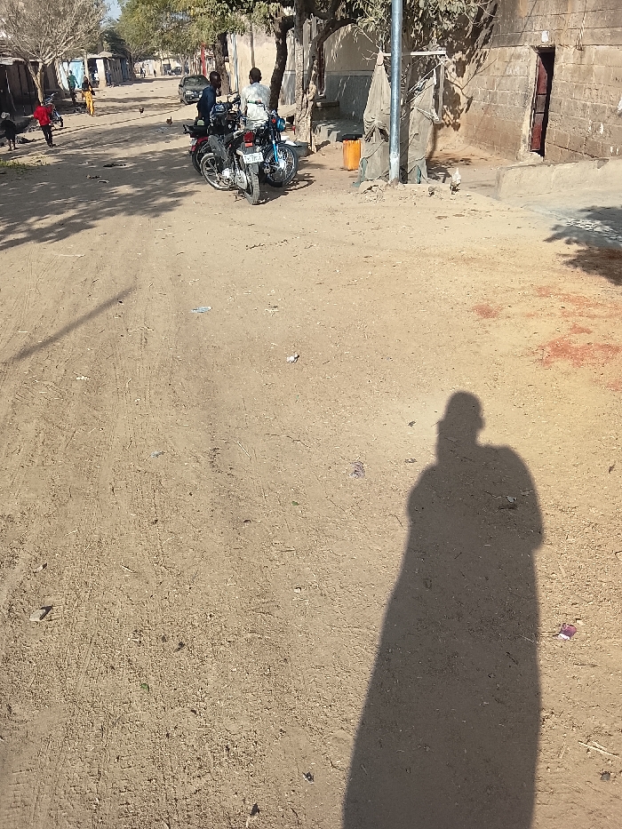 A sunlit dirt road is the main subject. Two parked motorcycles sit to the side, near figures, a building, and a pole. A light orange container is also near the building. People walk in the distance. The shadow of a person obscures the bottom right of the image.