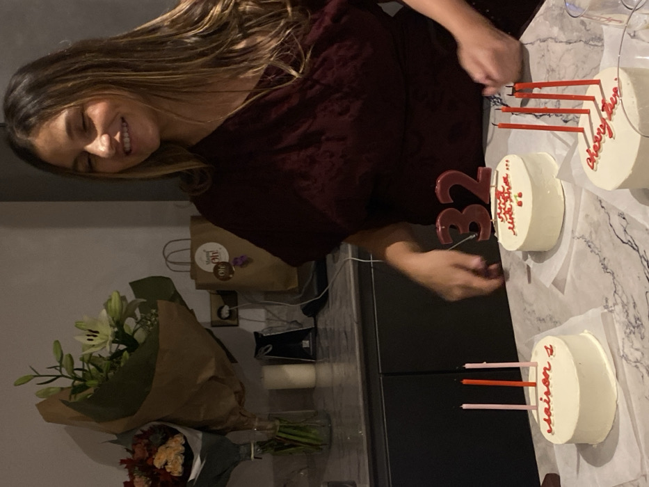 A woman smiles at three small, white cakes. Each cake has a name written on it in red icing. One cake also has a large, burgundy number 32 on it. Each cake has candles of different colors on it. A bouquet of flowers is to the left, in a clear vase. Behind the flowers is a brown paper bag. The counter has a marble look, and behind the cakes is a black cabinet.
