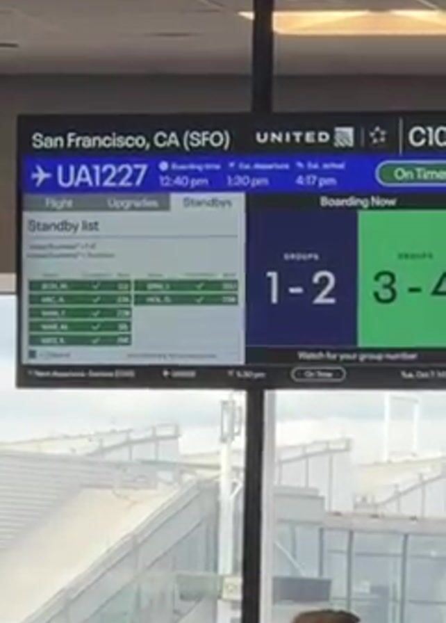 crowd of people waiting at an airport gate. An overhead display indicates that United flight UA1227 to San Francisco (SFO) is boarding for groups 1-4, with the flight listed as on time. The display also shows the standby list. Above the crowd is a sign for the "Transfer Shuttle by Gate 71 Terminal A & B." The airport appears well lit with large windows offering a view outside. The people are generally still, waiting for their turn to board.