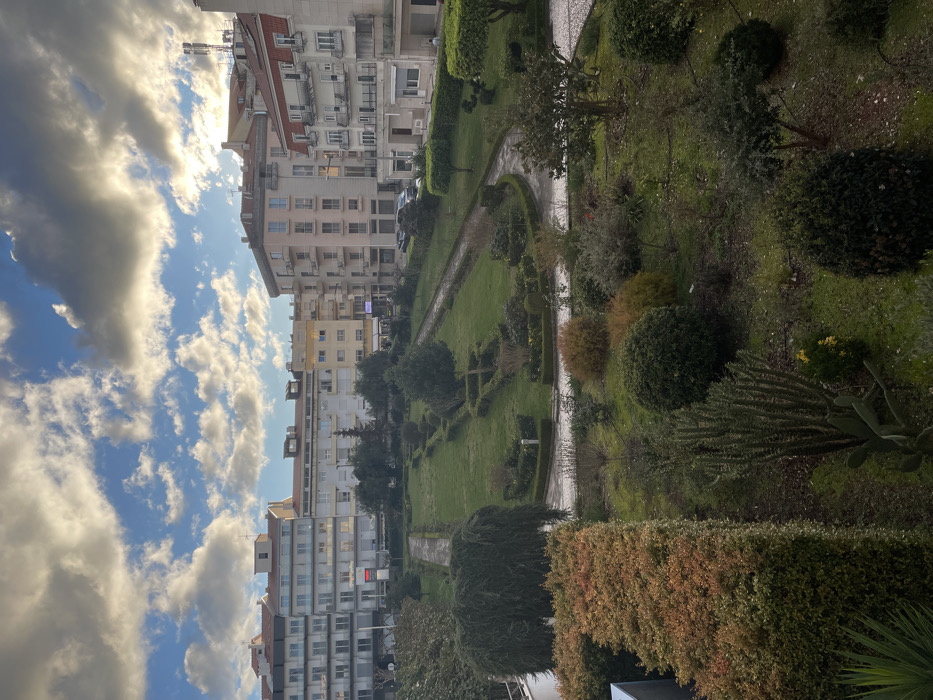 The image presents an elevated view of an urban landscape in Fátima, Portugal. The scene is illuminated by sunlight filtering through a sky dominated by scattered white and grey clouds against a blue background, suggesting daytime conditions. In the midground and background, a series of multi-story buildings, ranging from four to eight floors, define the urban periphery. These structures exhibit varied architectural styles with light-colored facades (white, beige, light grey, light pink) and include numerous windows and balconies, some with railings. Red-tiled roofs are visible on several buildings, and a cellular tower antenna is present on a rooftop in the far right. A street bordering the central green space on the right features several parked vehicles. A red illuminated sign is discernible on a building facade in the left-center background. The central and foreground areas are occupied by a public garden or park. This green space features expansive, mown grass lawns intersected by winding, light-colored paved pathways, which appear wet in sections. The garden incorporates various plantings, including a large, dark green, weeping-form tree or dense shrub on the left, alongside numerous smaller trees and diverse shrubbery, some of which are formally trimmed into topiary shapes or hedges. In the immediate foreground, a dense, multi-colored hedge with reddish-brown foliage occupies the lower-left, while various cacti and succulent plants are visible in the lower-center. No individuals are clearly visible or identifiable within the depicted scene. No specific actions or interactions are discernible.