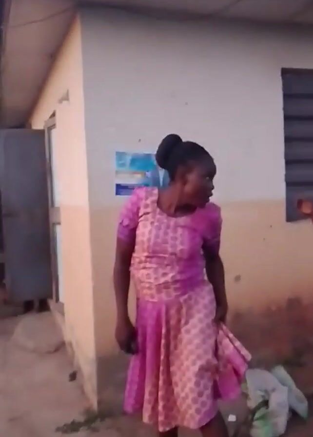 A woman in a pink dress is seen in a backyard-like area. She is dancing and looking at a building. A small child in a blue and green outfit is also present in the backyard area. There are other buildings and a water tank visible in the background.