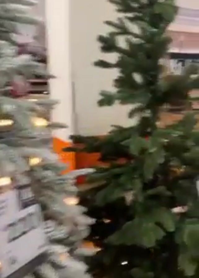 display of artificial Christmas trees in a retail environment. The trees are various shades of green, some are flocked with white to resemble snow. Some trees are lit with warm-toned Christmas lights. Price tags hang from the trees. The backdrop is a brightly lit interior with signage.