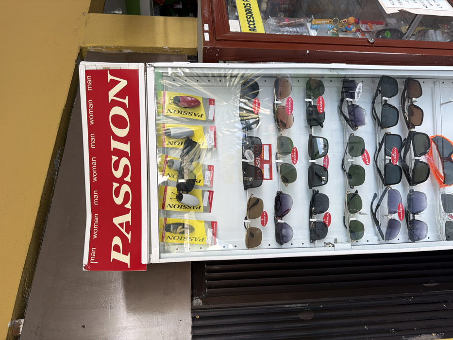 A retail display showcases sunglasses, with a red sign featuring the word "PASSION" vertically, flanked by "man" and "woman" labels. Various sunglasses are arranged within a glass case, some still in protective packaging. Above the display, a sign reads "ACCESORIOS." Below, a black, horizontally striped surface adds contrast.