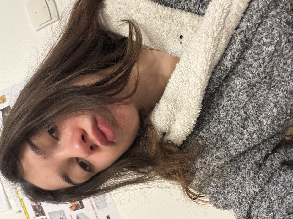 A young woman with long brown hair looks at the camera with slightly pursed lips. She has fair skin and dark eyes. She is wearing a gray and white textured robe or sweater with a fuzzy collar. Behind her is a light-colored wall with a light switch and some posters. The image is oriented at an angle.