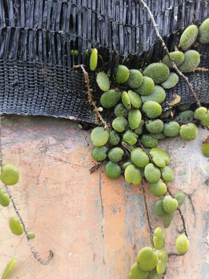 textured, peach-colored wall with a section of black netting above it. Green, coin-shaped leaves are growing on thin vines that attach to both the netting and the wall. The leaves are clustered densely in the upper portion of the image, becoming sparser as the vines trail downwards. Some leaves show small, white spots.