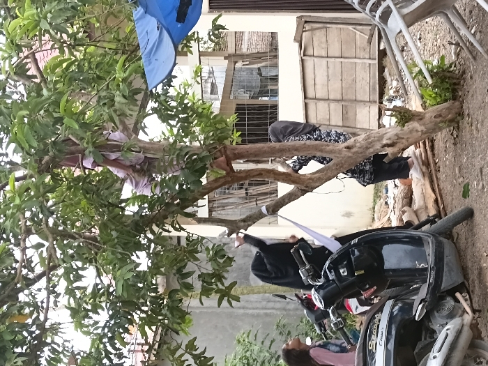 The image displays an outdoor scene in Mns Alue, Indonesia, featuring four individuals interacting with a leafy tree. One person, dressed in light-colored clothing, is perched high within the tree's branches, partially obscured by foliage. To the left of the tree, a woman wearing a black hijab and dark attire extends her right arm upward, holding a long white object, directed towards the tree's upper sections. Another woman, wearing a patterned hijab and dark clothing, stands at the base of the tree, looking upward and holding onto a lower branch or trunk, appearing to be assisting. A young girl with dark hair, wearing a light-colored top and jeans, stands further to the left, also looking up at the tree. In the foreground to the left, a black scooter is parked on the dirt ground. The ground is bare earth with scattered wood pieces and sparse green vegetation. In the background, a light-colored concrete building with windows and a visible tiled roof is present. To the right of the tree, a wooden structure and a partially visible blue tarp are discernible. A stack of white plastic chairs is visible on the far right edge of the frame.