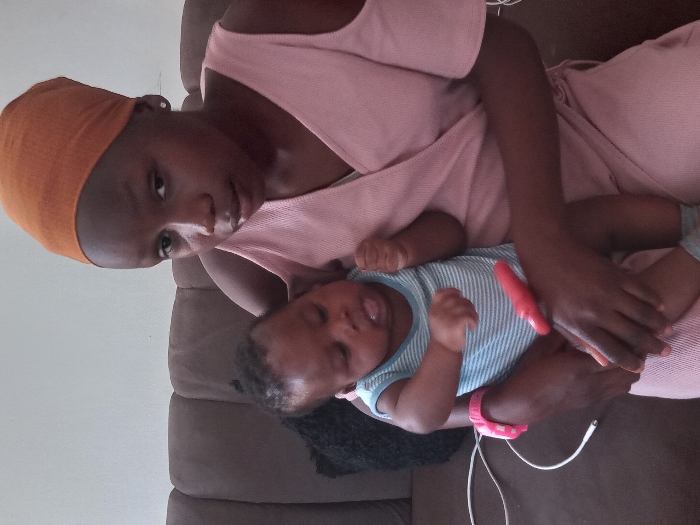 The scene depicts an adult female holding an infant in an indoor residential setting within the city of Rido, Nigeria