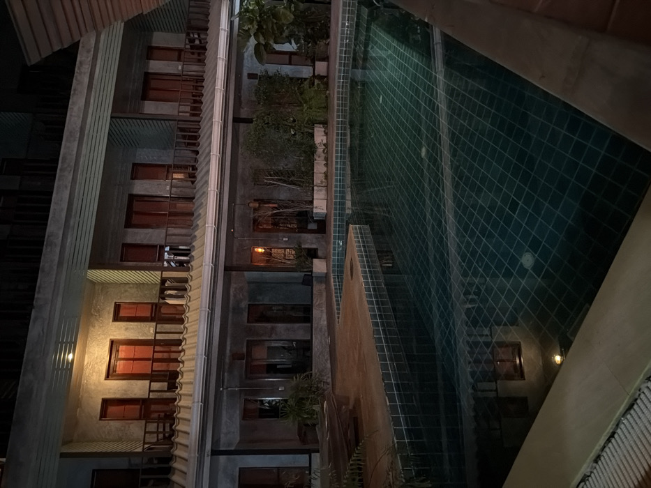 A night view showcases two tall structures beside a pool. The buildings feature multiple windows and balconies, with a ladder running up one side. Lush greenery is interspersed throughout the architecture. The pool has a tiled pattern and reflects the ambient light, with dark water adding depth to the scene. The photograph presents a perspective from above, adding to the overall sense of height and urban architecture.