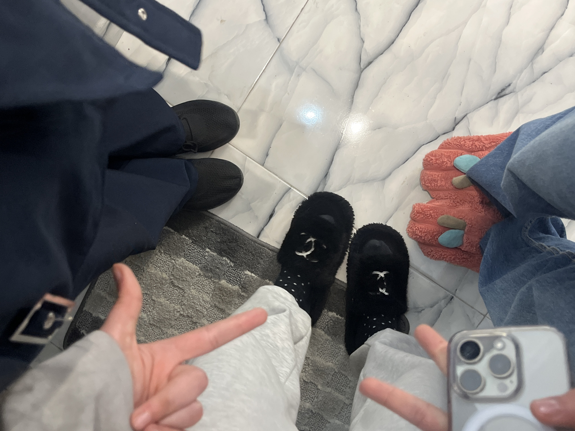 An overhead, downward-angled photograph depicts the lower bodies and footwear of three individuals positioned on a light-colored tiled floor with grey marble-like veining, in an indoor setting in Vagharshapat, Armenia. **Subjects:** 1. **Subject 1 (Top):** Wears dark blue trousers and black athletic-style lace-up shoes. A silver rectangular buckle is visible on the upper left. 2. **Subject 2 (Middle-Left):** Wears light grey sweatpants or casual trousers and black fluffy slippers adorned with white or silver "C"-shaped embellishments. A pale-skinned hand, likely belonging to this subject, extends from the upper left, forming a V-sign with the index and middle fingers. 3. **Subject 3 (Bottom-Left):** Wears blue denim jeans and coral-colored, textured, monster-claw-like slippers featuring light blue and beige toe details. A pale-skinned hand, likely belonging to this subject, is positioned in the lower left, holding a white-cased smartphone (consistent with an iPhone 13 Pro or 14 Pro model, with three camera lenses and a white MagSafe ring) to capture the image. This hand also forms a V-sign with the index and middle fingers. **Environment:** The subjects are standing on a polished, light grey or white tiled floor exhibiting dark grey veining, characteristic of marble or a marble-effect tile. A textured grey rug with a subtle patterned design is partially visible beneath Subject 1 and the hand of Subject 2. Reflections of overhead lighting are visible on the tiled surface.