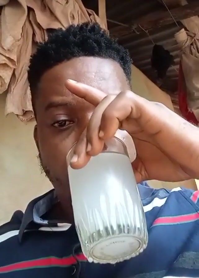 A man with dark, closely-cropped hair and a short beard is drinking from a clear glass filled with a milky liquid. He is wearing a blue and white striped shirt with red and green accents. He raises the glass to his lips and takes a drink, then holds the glass up in front of him. The background includes what appears to be a corrugated metal roof, some pieces of beige-colored cloth hanging, and part of a cream-colored wall.