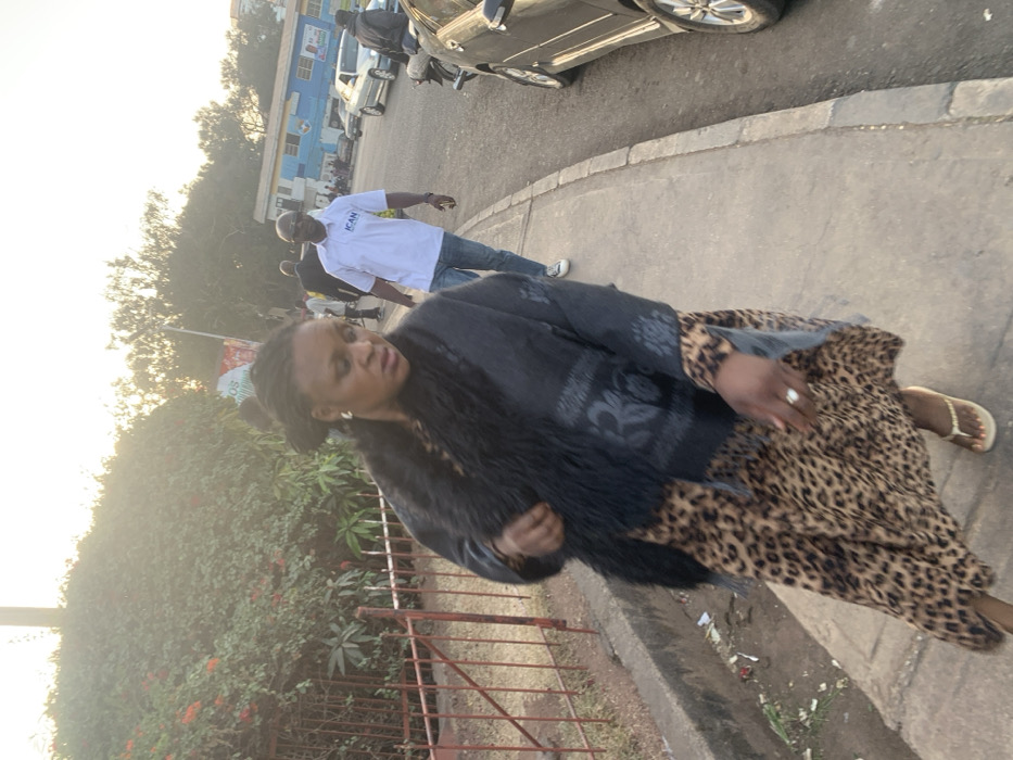 The image depicts an urban street scene in Jos, Nigeria, under bright, diffused sunlight. In the foreground, an adult Black woman with dark braided hair walks on a concrete sidewalk, looking downwards and to her left. She wears a long, leopard-print dress, a dark grey poncho-style top with embroidered patterns, a black fluffy scarf, and light-colored thong sandals. A ring is visible on her right hand. To the right and slightly behind her, an adult Black man walks on the same sidewalk, wearing a white polo shirt with a dark "ICAN" logo on the left chest, dark sunglasses, and blue jeans. Several other individuals are visible in the mid-ground, walking or standing on the sidewalk and near the street. To the left of the sidewalk, a red metal fence separates it from a dense area of green foliage and bushes, which include some red-flowered plants. Scattered debris and litter are visible along the base of the fence and sidewalk curb. To the right of the sidewalk, a paved road accommodates vehicles, including a dark sedan parked nearest the viewer, a lighter-colored sedan further down the road, and a motorcycle. In the background, across the road, light blue and white painted buildings are visible, with indistinct signage, one of which appears to reference "JOS".