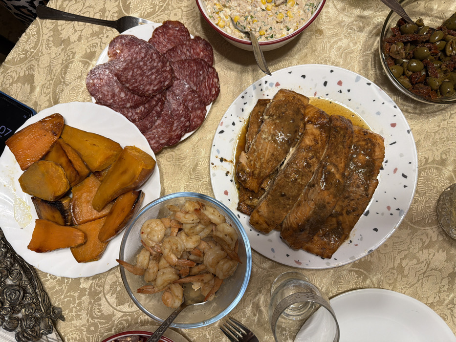 A table laden with a variety of dishes: a plate of sliced salami, a bowl of mixed salad, salmon fillets drizzled with sauce, a bowl of cooked shrimp, roasted sweet potatoes, and a bowl of olives and sun-dried tomatoes