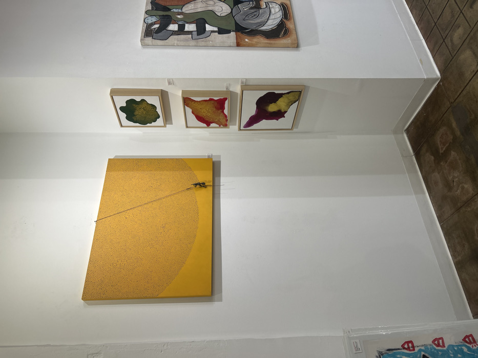 section of a gallery wall with several paintings. At the top, an abstract painting with geometric shapes is visible. Below it, three small framed artworks display colorful, organic forms. Further down, a large rectangular painting in yellow dominates the scene, covered in small dots and featuring a diagonal line with what appears to be a sculptural element. A painting with red and blue elements is visible in the bottom right corner. The walls are white and the floor is made of tiles.