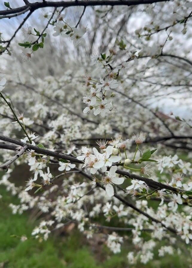 tree in full bloom. The tree's branches are laden with small white flowers. The background is blurred, suggesting a shallow depth of field. Green grass is visible at the bottom of the frame. The sky is overcast. A narrow paved walkway is visible on the left side of the frame.