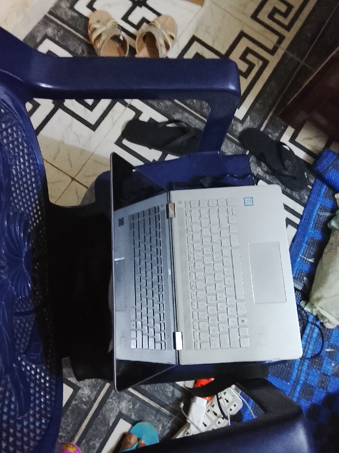 A silver laptop sits open on a blue chair. The keyboard and screen are visible. Adjacent to the laptop are two pairs of flip-flops: one black and one gold. In the lower portion of the frame, an additional turquoise flip-flop peeks out. The background features a patterned floor, and a partially visible blue mat lies next to the chair. Other objects, like a fan and a power strip, are also scattered around.