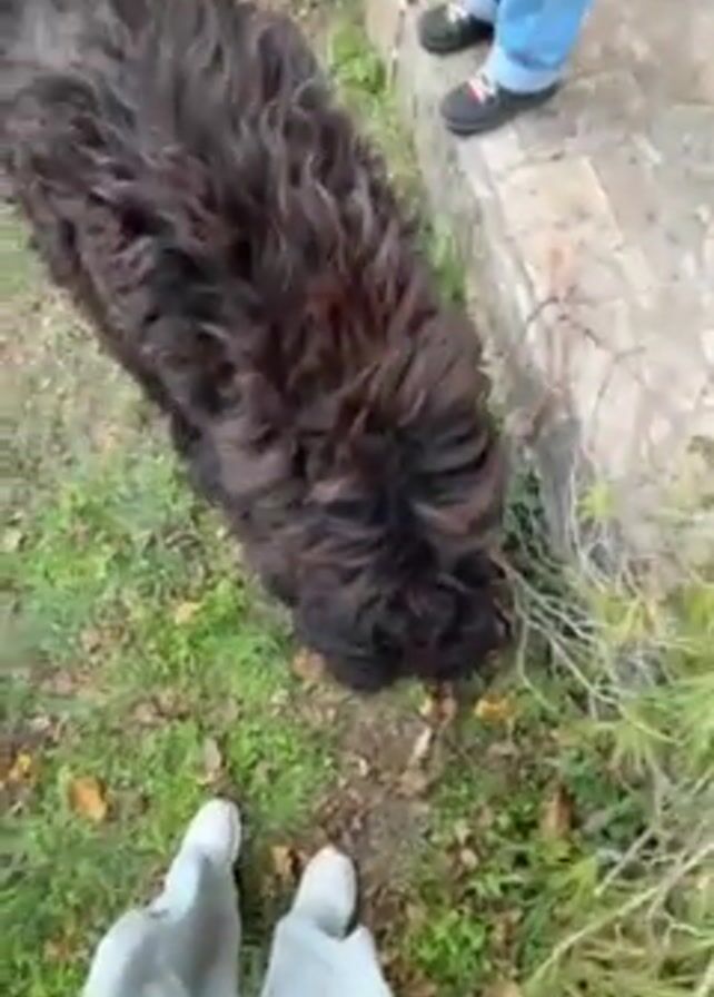 The scene unfolds outdoors, with a person standing on grass, wearing light gray pants and white shoes. A large, black, shaggy dog stands nearby, its head down, sniffing the ground. Another person, wearing blue jeans and dark shoes with red and white accents, stands slightly elevated on a concrete step behind the first person. The grass is interspersed with fallen leaves and small branches. The video appears to be taken from the perspective of the person standing on the grass. The dog seems to be intently exploring the ground with its nose. There's a sound of a dog barking in the background.