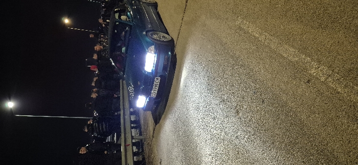 At night in Sofia, Bulgaria, a teal BMW E36 coupe with illuminated headlights is positioned on an asphalt roadway. The vehicle displays Bulgarian license plate "CO 1898 CH". A group of approximately 15-20 individuals, primarily males dressed in dark winter clothing, are gathered behind a metal crash barrier to the left of the car, observing the scene. A person is visible in the driver's seat of the BMW. The asphalt road surface shows visible aggregate and faint white markings. Two streetlights provide overhead illumination against the dark sky, with additional distant city lights visible in the background.