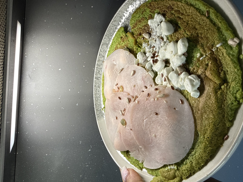 A close-up photograph displays a prepared meal on a round, light-colored plate with an ornate rim. The plate holds a large, circular green base, resembling a pancake or flatbread, which exhibits areas of darker green and browned texture. Layered on the green base are several thin, overlapping slices of light pink processed meat, consistent with deli ham or turkey. Adjacent to the meat is a cluster of white, curd-like dairy product, indicative of cottage cheese or crumbled feta. The entire dish is uniformly sprinkled with a mixture of seeds, specifically small brown flax seeds, lighter sesame seeds, and larger, flattened sunflower or pumpkin seeds, interspersed with a few tiny yellowish-green fragments. A human hand, featuring a manicured fingernail with light polish, is visible on the left, supporting the plate. The background consists of a dark grey, speckled surface, illuminated by a horizontal LED light strip positioned above, suggesting an indoor kitchen countertop or similar environment. The image contains no discernible landmarks or specific features to identify a precise location within the city of Dobrich, Bulgaria.