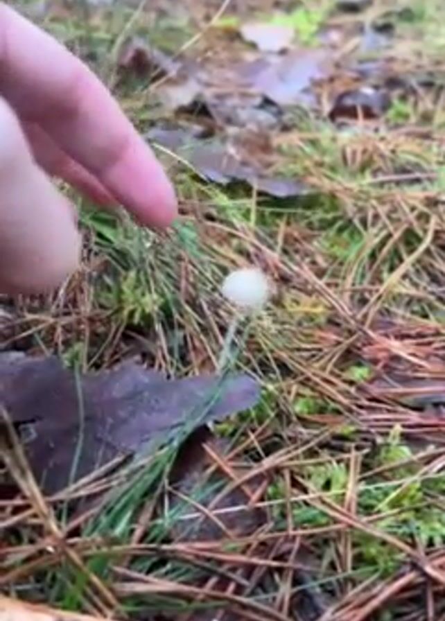 A hand touches a tiny, white mushroom growing among grass and pine needles on the forest floor
