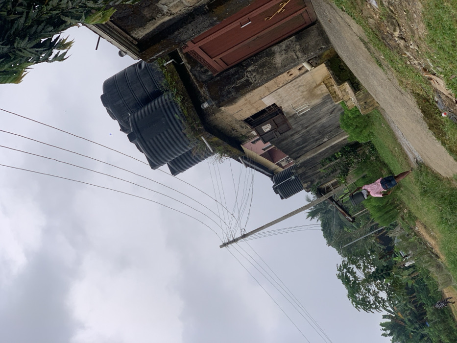 An outdoor scene depicts a house with two large black water tanks on its roof. Overhead, numerous electrical wires extend from a utility pole. A figure in a pink shirt and dark shorts stands on a grassy verge beside a narrow road. Cloudy skies are visible above, suggesting overcast weather. Lush green foliage surrounds the scene.