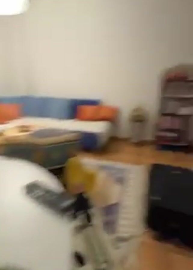 The video begins with a close-up shot of a laptop playing a video of a man in a suit. The laptop sits on a white table, with a partially visible blue sofa in the background. The camera then pans to a kitchen counter with white cabinets. A person with long dark hair pulled back into a ponytail appears, wearing glasses, a dark green sweater, and a white t-shirt. They stand behind the counter.