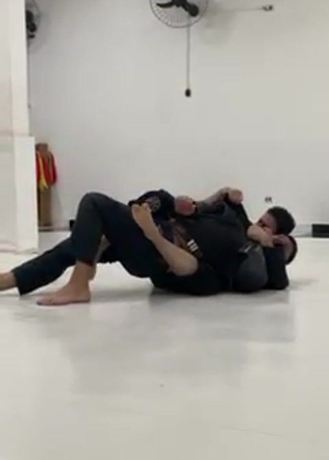 In a bright, well-lit room, two individuals are engaged in a grappling activity on a smooth, white floor. Both individuals are wearing black attire. One person is on their back, with their legs bent at the knees and feet on the floor. The second person is positioned on top, maintaining a close hold. The scene implies a training session or demonstration of grappling techniques. There's a white wall behind them with two fans attached. A red and yellow object is visible in the corner, beside a white beam. The scene is static and focused on the two individuals and their interaction.