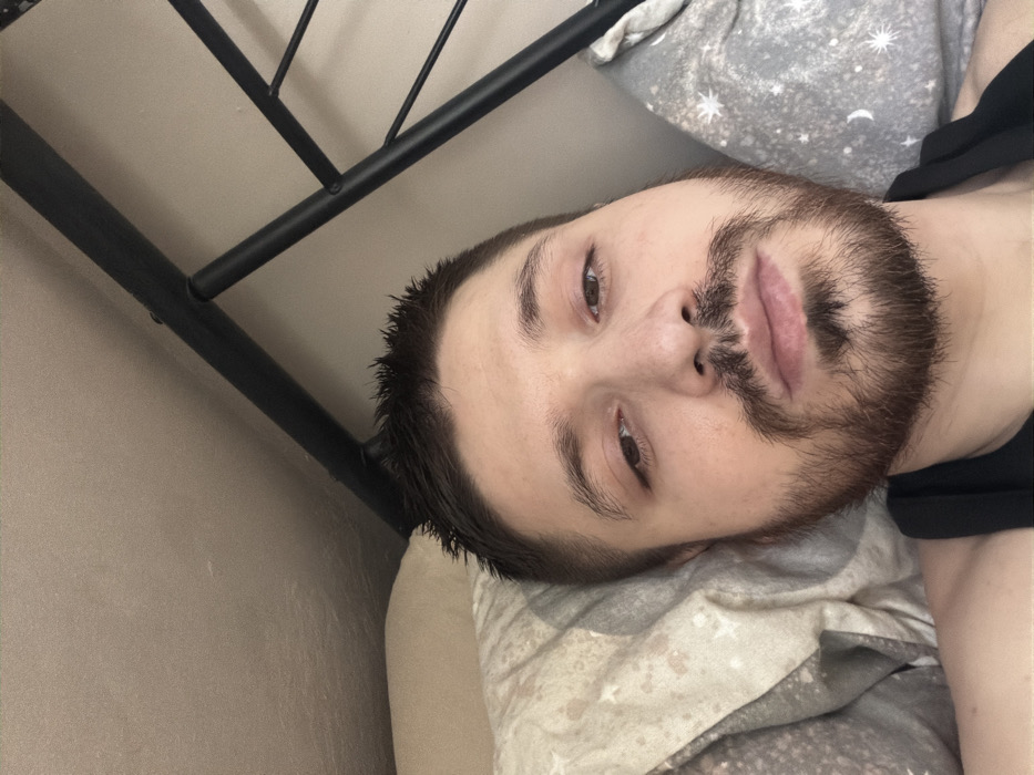 An adult male is depicted in an indoor environment, located in Pentre, United Kingdom. He is positioned horizontally, resting his head on a pillow. The subject has short, dark brown hair, a full dark brown beard and mustache, and fair skin. His brown eyes are open and directed towards the camera. He is wearing a dark-colored, sleeveless top. Bedding is visible, including a light-colored pillowcase with a repeating pattern of stars and crescent moons on the left and right, and a plain, light-colored pillow on the left. A dark-colored metal bed frame, composed of horizontal and vertical bars, is visible in the upper right quadrant. The background consists of a plain, light-colored wall or ceiling surface.