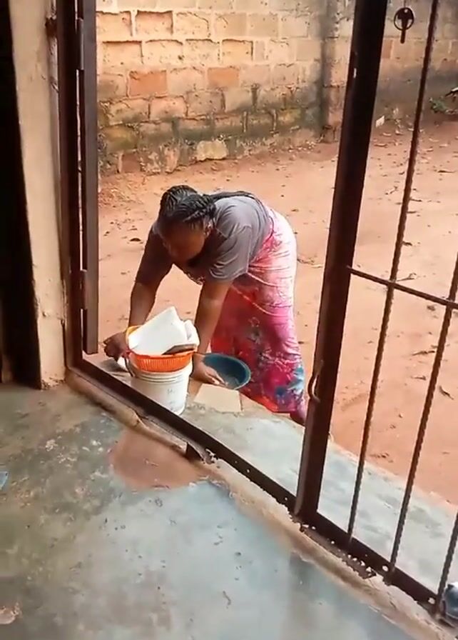 A woman is cleaning outside a doorway, as viewed from inside. The woman is bent over, holding a blue bowl in her right hand and using it to scoop water from a white bucket with an orange rim and a mesh strainer. The woman is wearing a gray shirt and a long floral-print skirt. She has dark hair styled in cornrows. The doorway has a metal security gate, open to the side. A pair of brown and white flip-flops are on the floor in the foreground. The ground outside the doorway is red dirt. A brick wall is in the background.