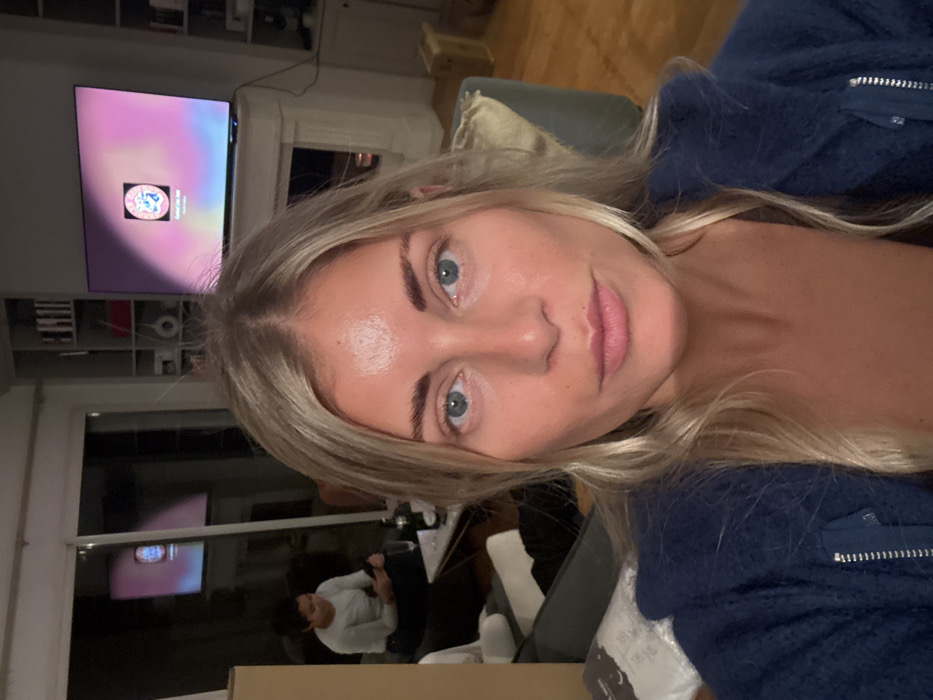 The image depicts an indoor scene, likely a residential living space. The primary subject is a blonde female, approximately 20-30 years old, with blue eyes and light skin, facing the camera directly. She has long, straight blonde hair with darker roots and a neutral facial expression. She is wearing a dark blue, textured, zip-up hooded garment. In the background, a room is visible, illuminated by artificial light. A large flat-screen television is mounted above a white mantelpiece, displaying a screen with a colorful gradient (pink to blue) and a central circular logo that appears to be for "RAID: Shadow Legends." To the left of the mantel, a built-in shelving unit contains various items. To the far left, a large cardboard box is partially visible. Through a glass partition or doorway on the left side of the frame, another individual with dark hair, wearing a light-colored long-sleeved top, is seated. This person is looking down at a mobile phone. On a coffee table in front of this individual, two champagne flutes and a bottle in a cooler are present. The flooring throughout the visible areas appears to be hardwood. The specific location within Rueil-Malmaison, France, cannot be determined from the visual information provided.