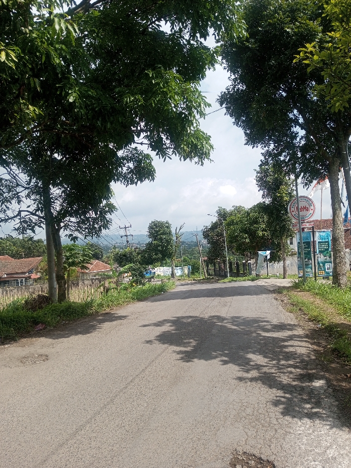 The image depicts an asphalt-paved road ascending a gentle incline in a semi-rural or exurban area of Unknown, Vietnam, under a partly cloudy sky. The road surface is gray and exhibits minor cracks and areas of erosion. Strong shadows from overhead foliage are cast across the road. On the left side of the road, a strip of grass and low vegetation borders a fence-like structure composed of vertical, light-colored stakes. Beyond this, several single-story residential buildings with terracotta-tiled roofs are visible. Mature trees with dense green canopies line the roadside, and power lines extend across the upper-left frame, supported by utility poles further in the distance. On the right side of the road, another strip of grass separates the pavement from more trees. A circular white sign with red text, including the phrases "PANGKAT AMBALAN" and "sahMa," is mounted on a pole near the road. Behind this sign, multiple flags are displayed vertically, one of which prominently features red and white horizontal stripes. Further down, a light pole with an attached streetlamp is present, along with various advertising banners and posters attached to a wall or fence. These banners include text such as "SOLUSI MUDA" and "REMAJA KREATIF" on blue and white backgrounds. The background reveals undulating terrain with scattered trees and distant structures, culminating in a horizon dominated by green hills or mountains under a bright, cloudy sky. No individuals or active interactions are visible within the scene.