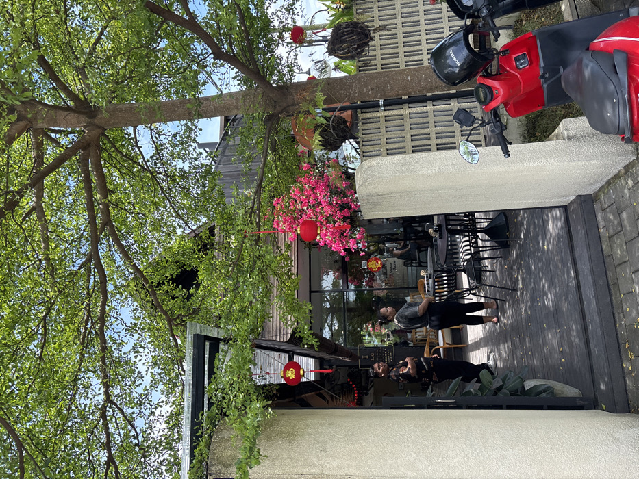 A sideways shot of a building with an outdoor seating area. Tables and chairs are visible on the wooden deck. A tree with dense green leaves extends over the building. Pink flowers and red lanterns decorate the exterior. A red scooter is parked nearby. Two people are standing on the deck. A decorative concrete structure sits atop a cream-colored wall.