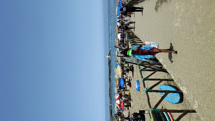 This image depicts a bustling daytime beach scene identified as located in Barranco, Peru