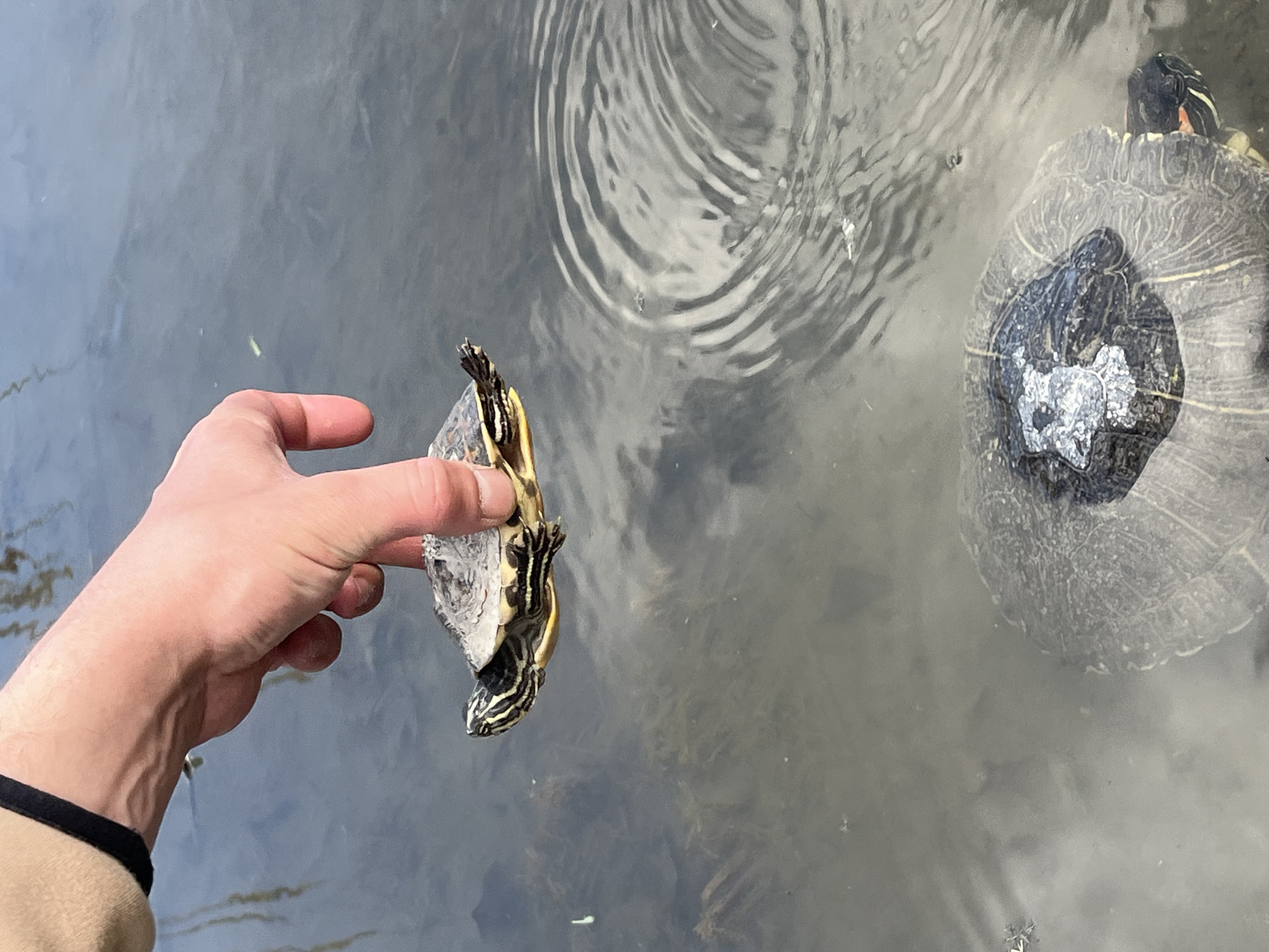 A person is holding a turtle upside down by its shell near a body of water containing another turtle. The turtle being held has a yellow and black striped neck and limbs. The other turtle in the water is larger with a dark, mottled shell. The water's surface is rippled. The location cannot be determined from the image.