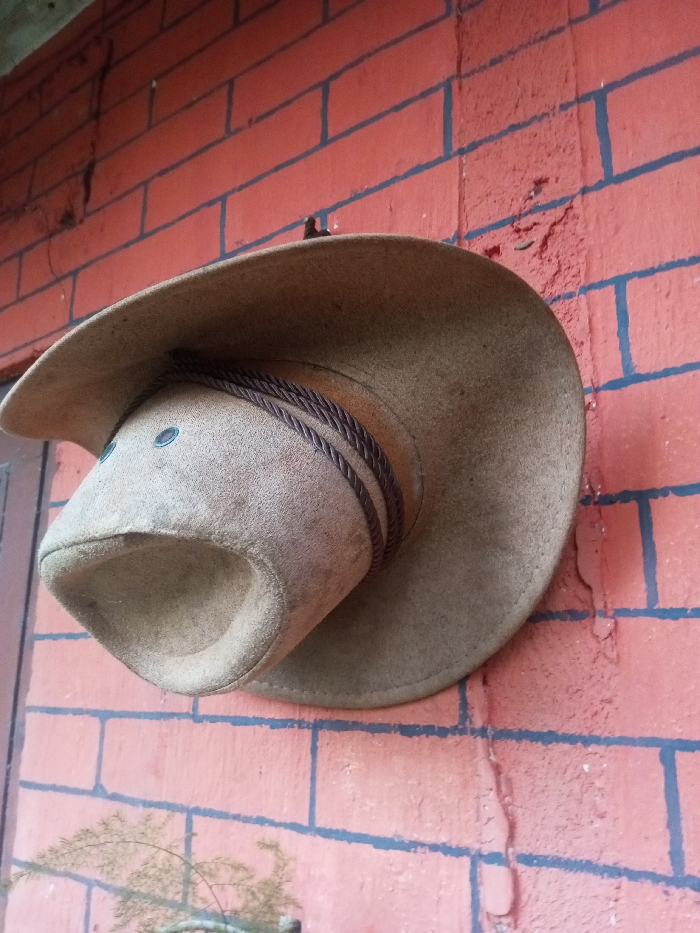 - "A light brown, wide-brimmed felt hat, featuring a dark brown braided band around its crown and two dark circular vents, is centrally positioned, hanging vertically on a hook" by FM-udL9f1, licensed under CC BY 4.0
