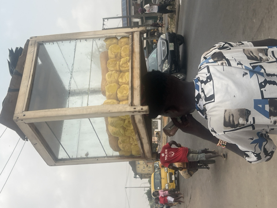 The image depicts an active street scene in Egan, Nigeria, under an overcast sky. In the foreground, viewed from behind, an individual with short dark hair wears a white and blue patterned short-sleeved shirt. This person carries a large, rectangular display case, constructed from wood frames and glass panels, balanced on their head. The case contains multiple rows of yellowish, rounded loaves of bread or similar baked goods. The individual holds a rolled bundle of currency notes to their right ear or mouth. A multi-colored beaded bracelet is visible on their right wrist. In the midground, to the left, a male wearing a red t-shirt with a white "TCL" logo and dark shorts pushes a two-wheeled handcart laden with goods. Behind him, a yellow mini-van is visible, alongside two females, one in a pink top and the other in a white top, walking on the paved roadside. To the right of the central figure, a dark-colored Lexus SUV is present on the road. The background features additional individuals, utility poles with overhead power lines, and multi-story buildings. The scene conveys a busy urban environment with pedestrian and vehicular activity.