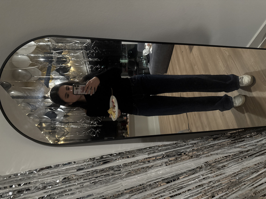 A young adult female is depicted in a full-length mirror selfie within an urban high-rise residential interior. The precise location within Austin, United States of America, is not identifiable from the visual content. The female, possessing dark hair, is dressed in a dark long-sleeved top, dark blue jeans, and white sneakers. She holds a smartphone with a light-colored, patterned case in her right hand, positioned to capture her reflection. In her left hand, she holds a white plate containing a portion of food characterized by yellow and red-flecked items. To the left of the mirror, a vertical cascade of silver tinsel streamers is present. The mirror's reflection reveals numerous silver and dark-colored balloons suspended near the ceiling, indicating a celebratory atmosphere. Further in the reflected background, a dark sofa and a table holding a red-tinted drink are visible. Large windows behind the furniture offer a view of a night-time cityscape. The flooring throughout the visible interior consists of light-colored hardwood.