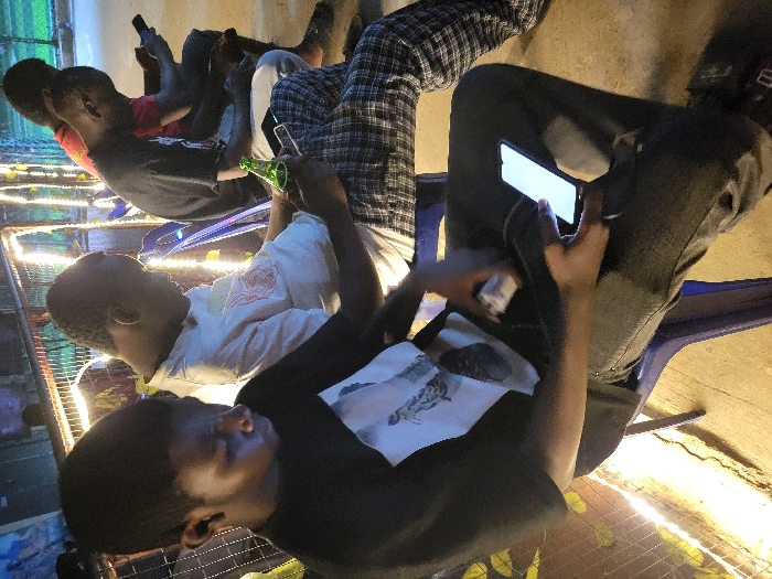 Several young individuals are seated, engrossed in their phones. One person holds a green bottle. The scene is illuminated by string lights. Most of them are dressed casually, with one wearing a black-and-white patterned pair of trousers. Some are seated on blue plastic chairs, while others are on what appears to be a bench or a similar structure. The setting could be an outdoor area.