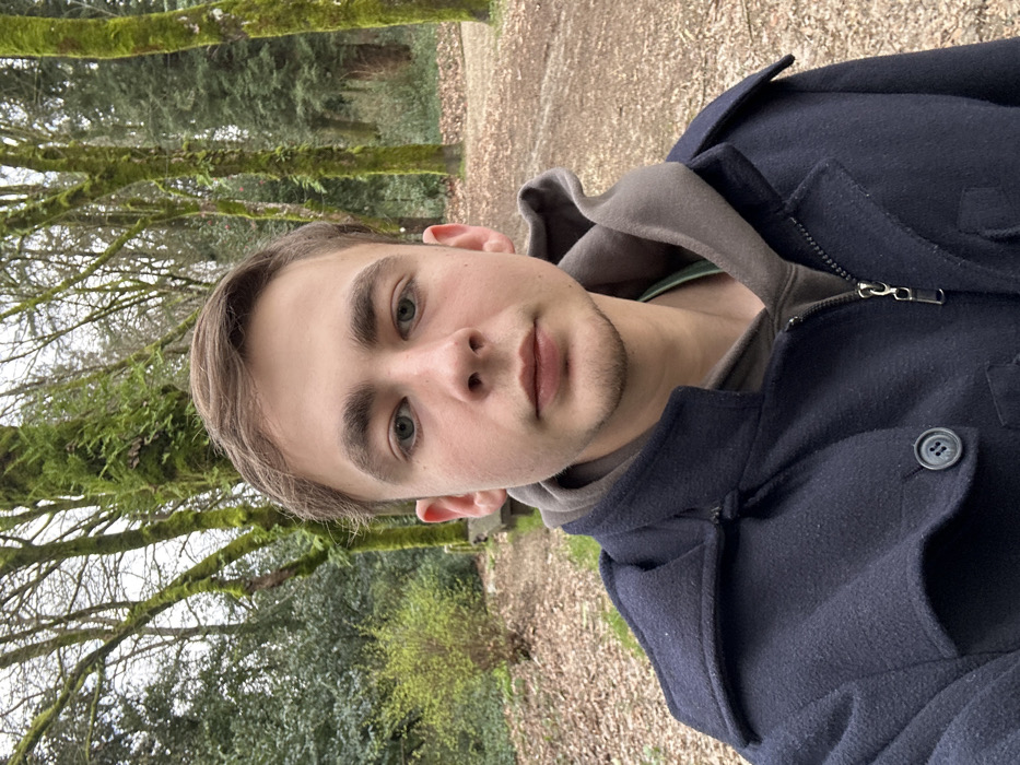 A young man with light skin and short brown hair is centered, facing the camera. He has light green eyes and a light beard. He wears a grey hooded sweatshirt under a dark blue pea coat. The background is a wooded area with tall moss-covered trees and a path covered in leaves. The photo is taken from a slightly low angle.