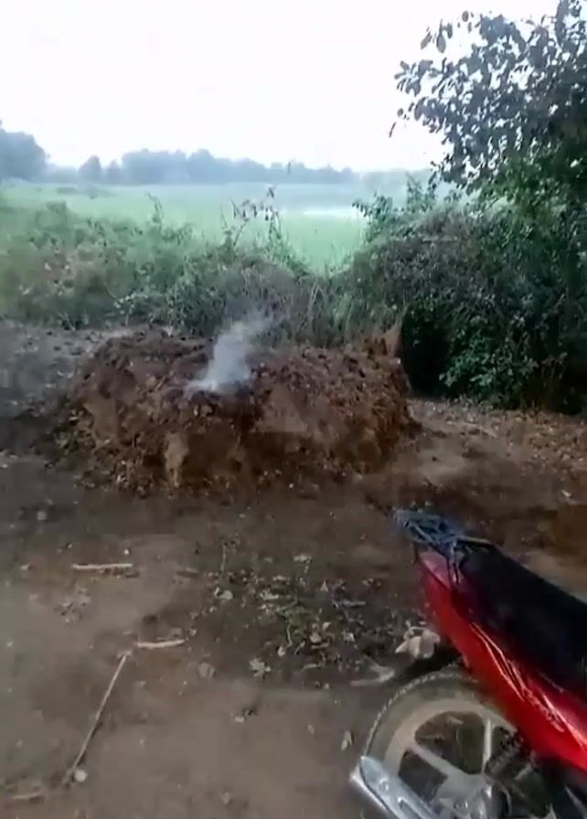 The camera pans from a steaming pile of dirt to a red motorcycle parked next to a tree