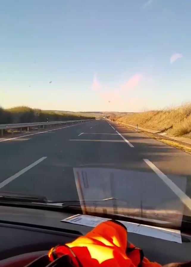 driver's point of view driving on a relatively empty highway on a bright, sunny day. The road has two lanes going in the same direction, and there are guardrails on both sides. The surrounding landscape appears dry with yellow and brown vegetation. The dashboard of the car is visible, with a piece of paper attached to the windshield. The driver is wearing an orange jacket. The sky is clear and blue.