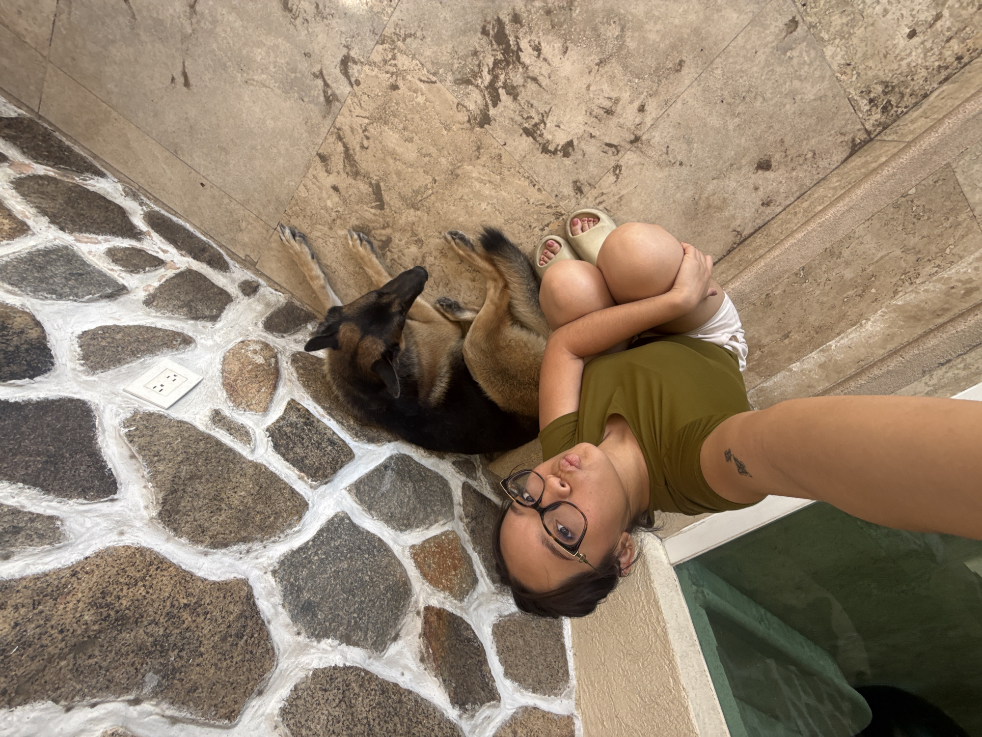 A tilted, high-angle, selfie-style photograph captures a young woman and a German Shepherd-type dog in an indoor setting. The woman is fair-skinned, with dark hair pulled back. She wears glasses, an olive-green t-shirt, and white shorts. She is positioned close to the camera, with her knees drawn to her chest. A small tattoo is visible on her right arm. She is wearing light-colored slide sandals. Next to the woman, a German Shepherd dog lies on its back with its legs splayed. The dog has typical German Shepherd coloration: black and tan. The background consists of two distinct flooring types. On the left is a rustic stone tile pattern with white grout. On the right is a more uniform, light-brown tile. A white electrical outlet is visible on the stone tile section. A section of greenish tile is visible on the right. Based on the tile work, window and presumed weather, it is speculated that the photo was taken in Acapulco, Mexico. However, there are no distinguishing features in the image that definitively confirm this location. The location cannot be confirmed solely from the image.
