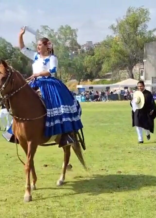 A woman in a traditional white and blue dress rides a brown horse across a grassy field. She is waving a white cloth in her right hand. A man in a black poncho and large white hat walks in the background. There are trees, buildings, and tents visible in the distance, as well as other people watching the event. The horse is in motion, with its front left leg raised in the air.
