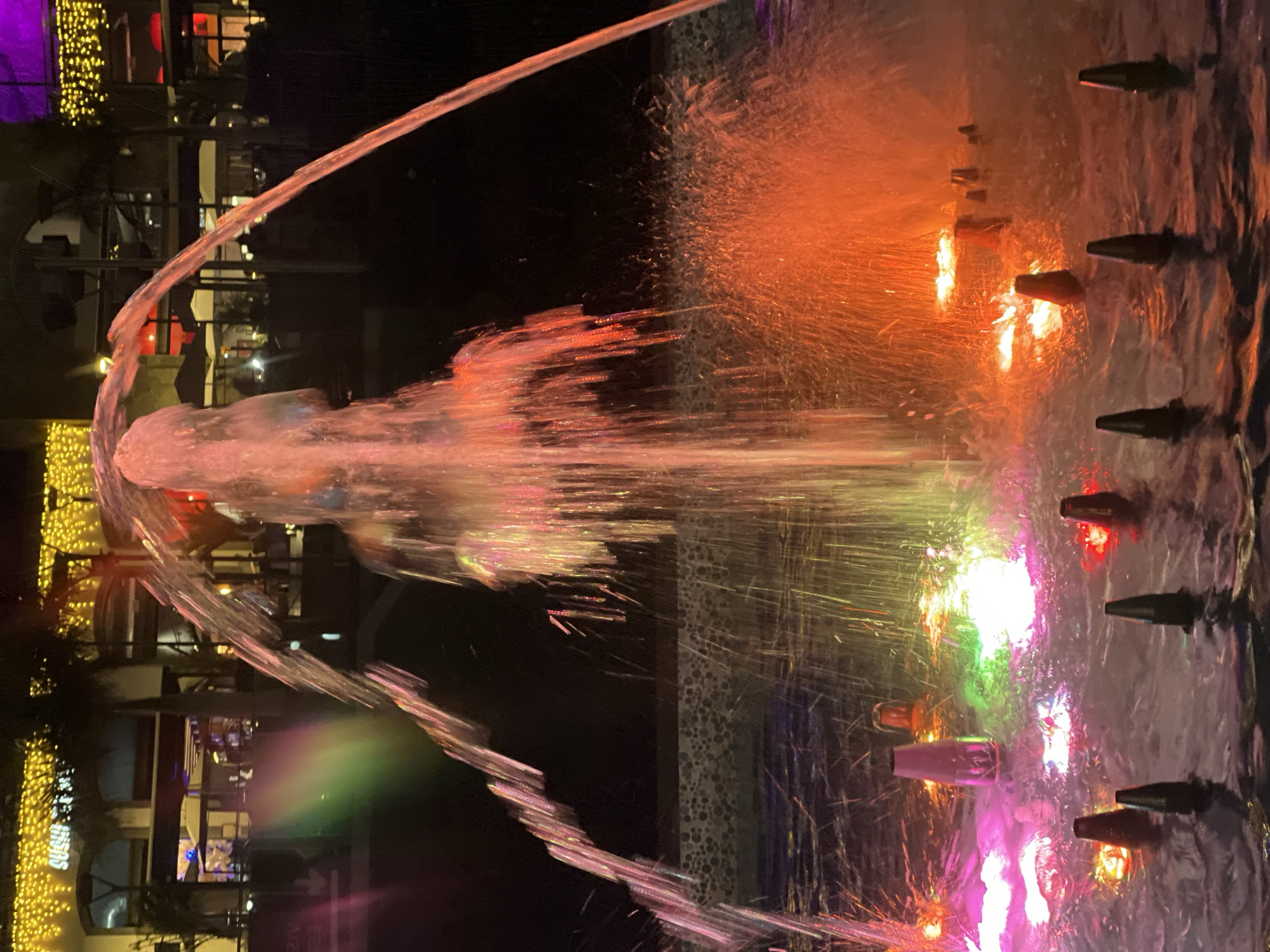 A brightly lit, multi-colored water fountain is depicted at night in El Chaparral, Spain. The fountain features multiple water jets illuminated in pink, purple, green, orange, and red, creating various arcs and splashes within a dark water basin. Several conical nozzles are visible submerged and partially submerged in the water, contributing to the jet formations. In the background, commercial buildings, likely restaurants, are extensively adorned with warm yellow string lights. A partial "SUSHI" sign is discernible on one building facade. Silhouetted palm trees are visible between the fountain and the illuminated structures. No distinct individuals are clearly visible in the immediate foreground, though faint, indistinct shapes suggest human presence within the distant background establishments. The scene is characterized by a dark night sky and significant artificial illumination.