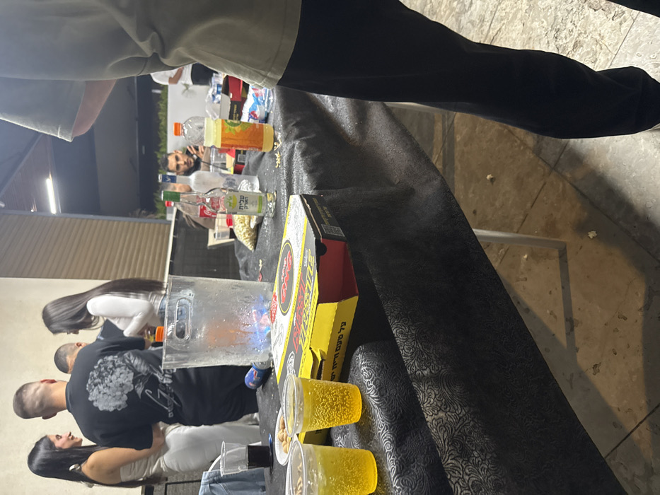 The image depicts an outdoor evening social gathering, presumably within Rishon LeZion, Israel. An unspecified number of individuals are present, with six distinctly visible. In the foreground, partially visible on the right, stands a person wearing a light-colored short-sleeved top and dark pants, with their back to the camera. A rectangular table, draped with a dark patterned tablecloth, occupies the center. On the table, from left to right, are two clear plastic cups filled with a yellow, effervescent liquid. Next to these, a red and yellow pizza box with Hebrew text, "על טעם וריח אין להתווכח" (There's no arguing about taste and smell), rests. Further right, a clear plastic ice bucket contains a lit blue flame, likely from a small burner, and a blue and orange object resembling a lighter. A half-empty plastic cup with dark liquid and ice, alongside a small dish of nuts, is also visible. Several bottles are arranged on the table, including a clear bottle with a white label reading "עלית הדרים" (Elite Hadarim), a clear bottle with a dark label, a green glass bottle, a red Coca-Cola bottle, and an orange plastic bottle with yellow liquid. Scattered popcorn remnants are visible on the table and the tiled floor. In the mid-ground left, four individuals are conversing. A woman in a white strapless top and white pants stands facing right. Behind her, a man with short dark hair is seen from the back, wearing a black t-shirt featuring a white floral design and "Gucci" text. To his right, another man's face is partially obscured. A second woman with long dark hair, wearing a white long-sleeved top, faces left, interacting with the group. A blue denim jacket is draped over an object in this area. Further in the background, to the right of the table, a man with short dark hair and a beard sits, looking forward. The background consists of a light-colored slatted wall or fence and a dark, indistinct area, indicating artificial lighting at night. The specific location within Rishon LeZion, Israel, is not identifiable from the imagery.